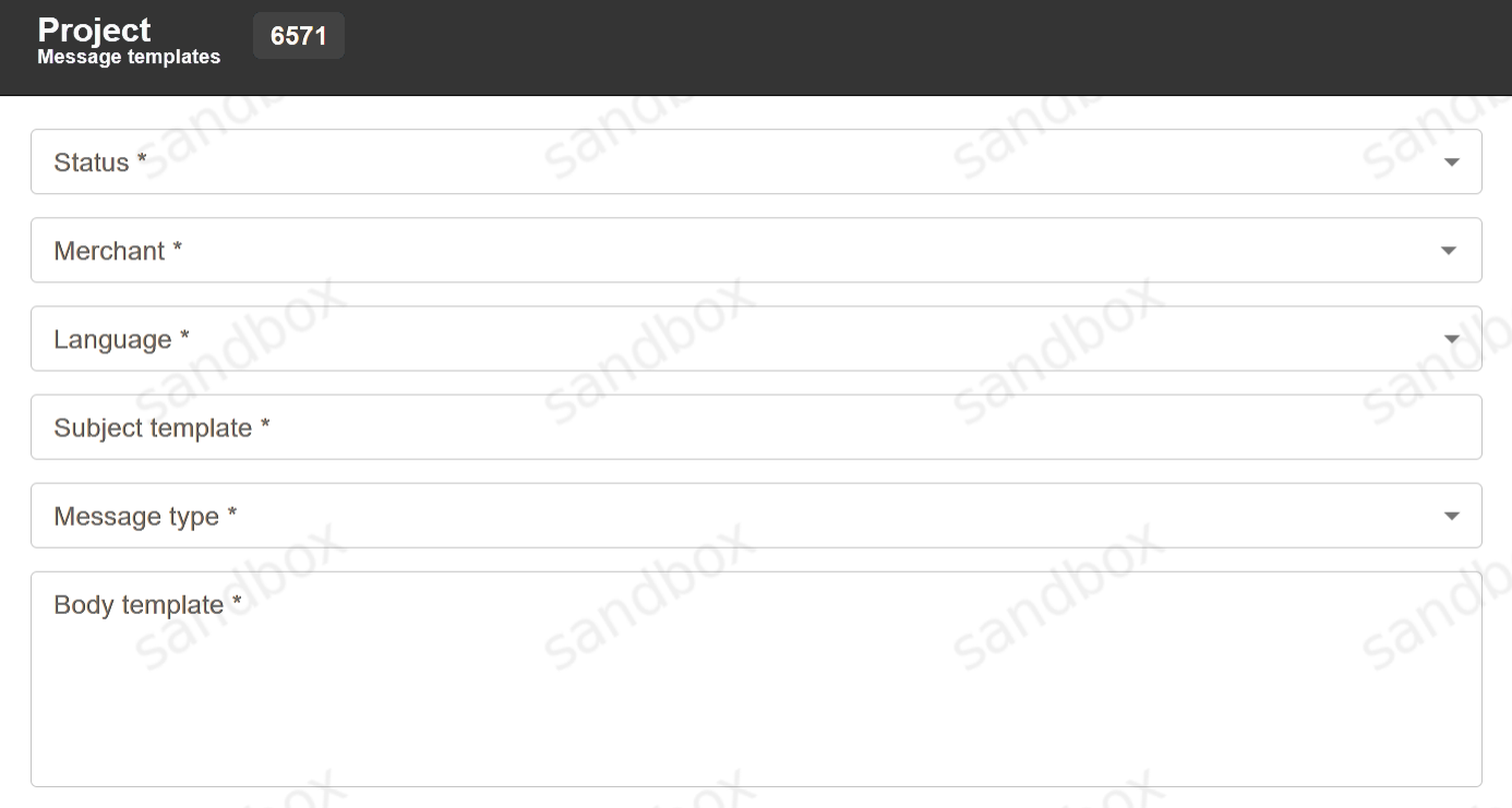 Message templates can be used to send SMS or E-mail messages to customer after each successful transaction. Merchant must provide their message server credentials to Cyber support manager in order to send such messages from merchant address. Templates are created using the Template button. After pressing it, a window with new template details will open: