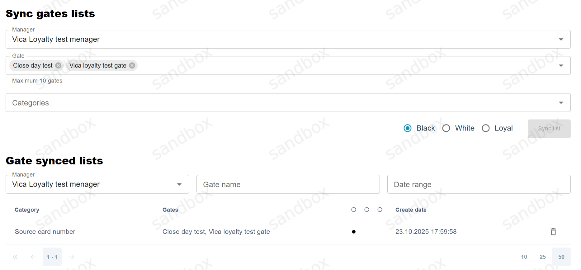 To synchronize two gate lists, administrator can use synchronizebutton synchronize list feature. After synchronizing, lists from both gates will filter transactions as if you joined your two lists.