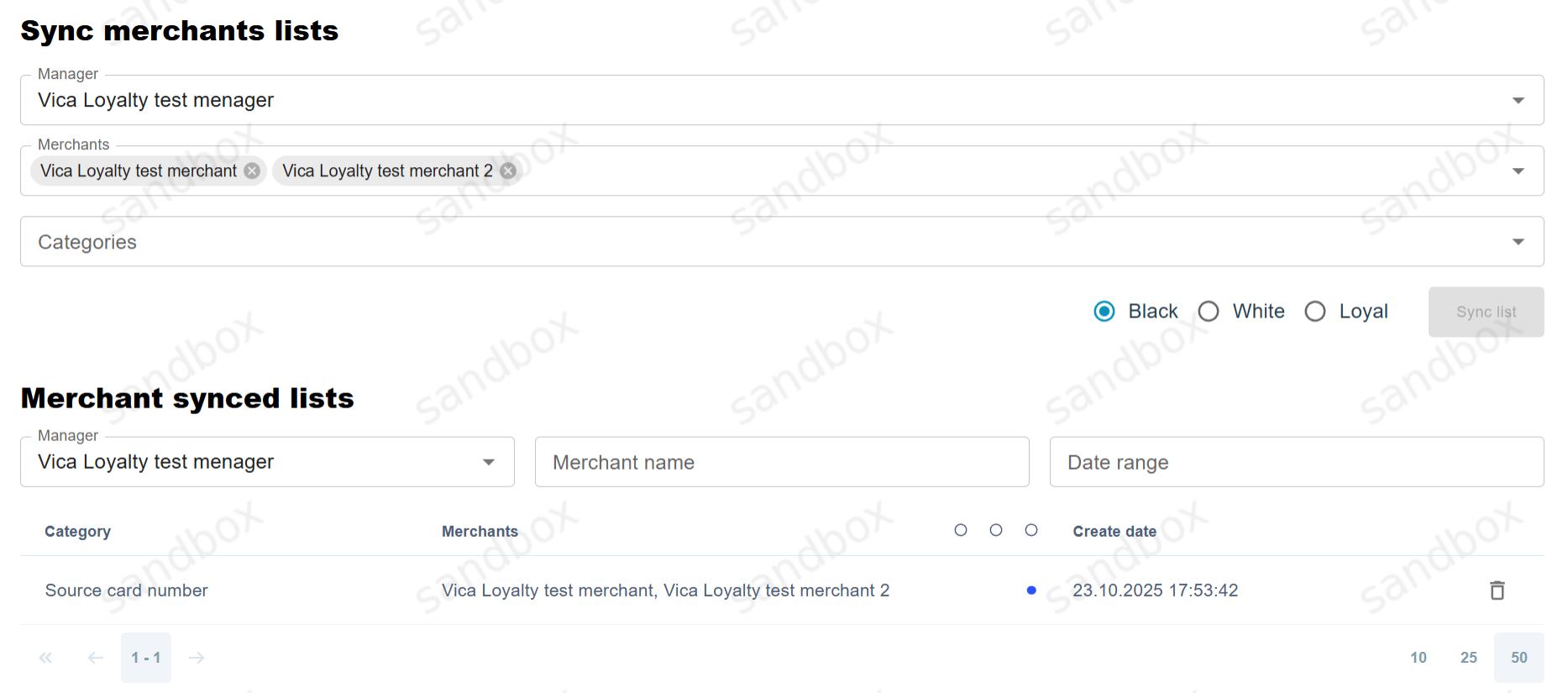 To synchronize two merchant lists, administrator can use synchronizebutton synchronize list feature. After synchronizing, lists from both merchants will filter transactions as if you joined your two lists.